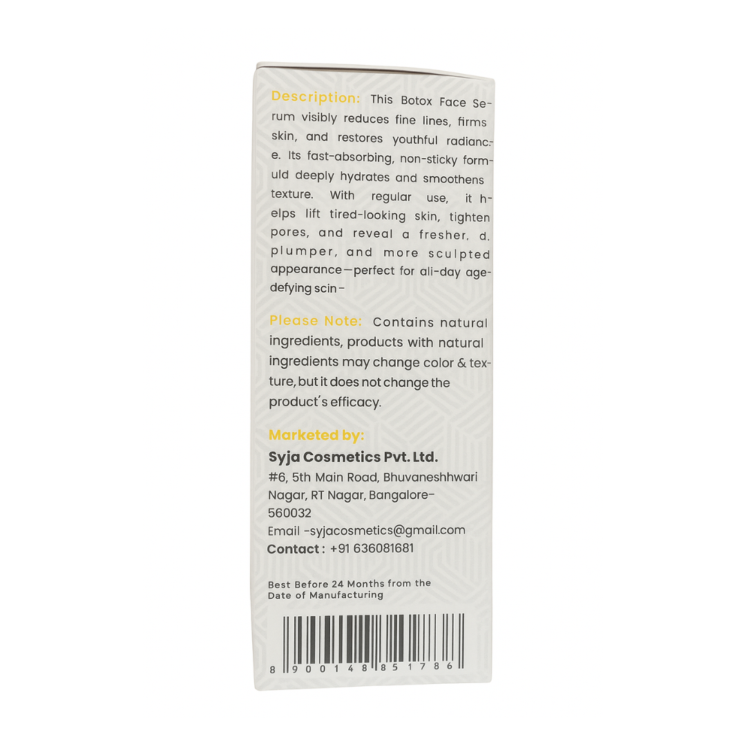 Experience youthful radiance with the SYJA Anti-Ageing Face Serum. Powered by Acetyl Hexapeptide-8, Hyaluronic Acid, Niacinamide & Bioplacenta, it reduces fine lines, firms skin, and restores hydration for a glowing, sculpted look.